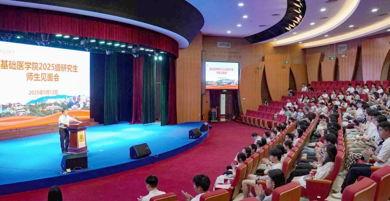 9月12日,基础医学院2025级研究生师生见面会在校本部国际会议厅举行,学院领导、导师代表与新生齐聚一堂,共话学术理想与医者担当。学院党委书记闫晓倩结合党对高校思想政治教育的要求与基础医学的学科特点,向新同学分享三个关键词:“守心”——以仁心铸魂,把稳思想之舵。“求道”——以匠心治学,锤炼科研硬功。“躬行”——以行动担责,践行医者使命,鼓励同学们紧握“为医学立根、为健康铸魂”的精神火炬,做“把论文写在...