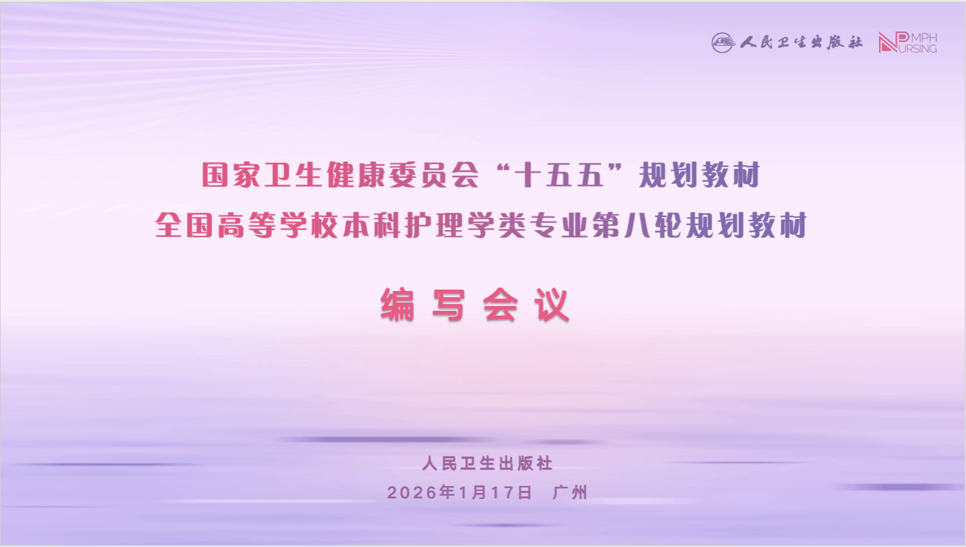 1月16日至18日,由国家卫生健康委员会指导、人民卫生出版社主办、我校承办的国家卫生健康委员会“十五五”规划教材全国高等学校本科护理学类专业第八轮规划教材编写会议召开。会议旨在推动护理学教育创新发展,为护理人才培养提供优质教材支撑。第六届全国高等学校护理学类专业教材评审委员会副主任委员吴瑛、李小妹、桂莉,人民卫生出版社医学教育中心护理编辑部主任翟慧、我校副校长许可慰,教务部、人卫社编辑团队以及10本教...