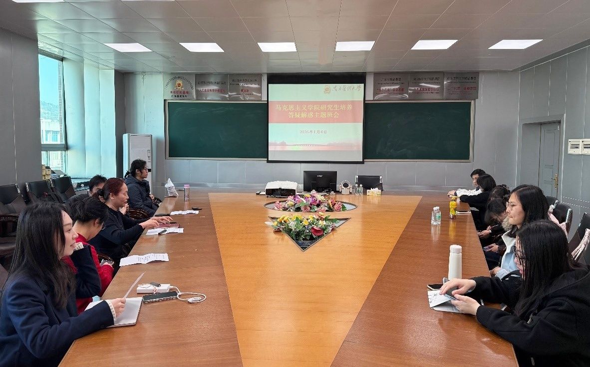 为强化学术规范和遵规守纪底线意识,引导研究生明确培养目标,做好学业和就业规划,1月4日下午,马克思主义学院召开研究生培养答疑解惑主题班会。学院党委副书记侯红莲等领导和相关部门负责人,辅导员及2025级、2024级全体研究生和2023级研究生代表参加会议。2023级学生代表池乐晴、柯司烨两位同学结合自身科研经历,围绕论文写作、时间管理、压力调适等方面与研一、研二同学进行了深入交流和学业就业的经验分享。教研办主任徐...
