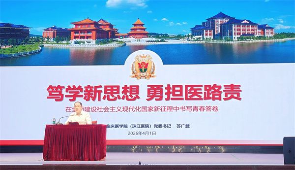 4月1日,第二临床医学院党委书记苏广武以“笃学新思想,勇担医路责”为题,为本科2023级全体学生讲授“思政第一课”。苏广武立足时代发展关键节点,结合国内外发展形势,引导学生深刻感知自身职业发展与中国式现代化建设同频共振的时代机遇,进一步明晰青年医者的使命担当。他还深入解读医疗领域科技创新前沿趋势,聚焦AI医疗、量子科技、6G远程医疗等新技术,阐释了卫生健康新质生产力发展的内在要求,鼓励学生主动融入科创浪...