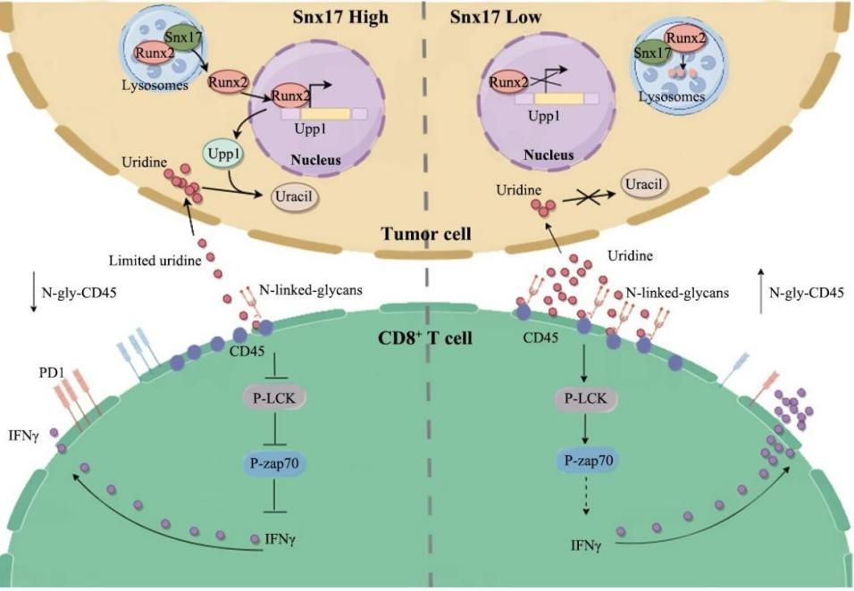 肿瘤免疫治疗常遇到一个棘手问题:治疗一段时间后会耐药,癌细胞又开始疯狂生长。近日,基础医学院病理学系/南方医院病理科梁莉、王志章教授团队发现了一种能“激活”免疫细胞、对抗肿瘤的“免疫代谢物”——尿苷,为癌症治疗提供了全新思路。本研究找到了产生耐药的“元凶”之一——SNX17蛋白。SNX17蛋白就像一个“抢食者”, 通过稳定转录因子RUNX2,促进尿苷分解酶UPP1的表达,加速尿苷的分解消耗,最终让肿瘤微环境里的尿苷...