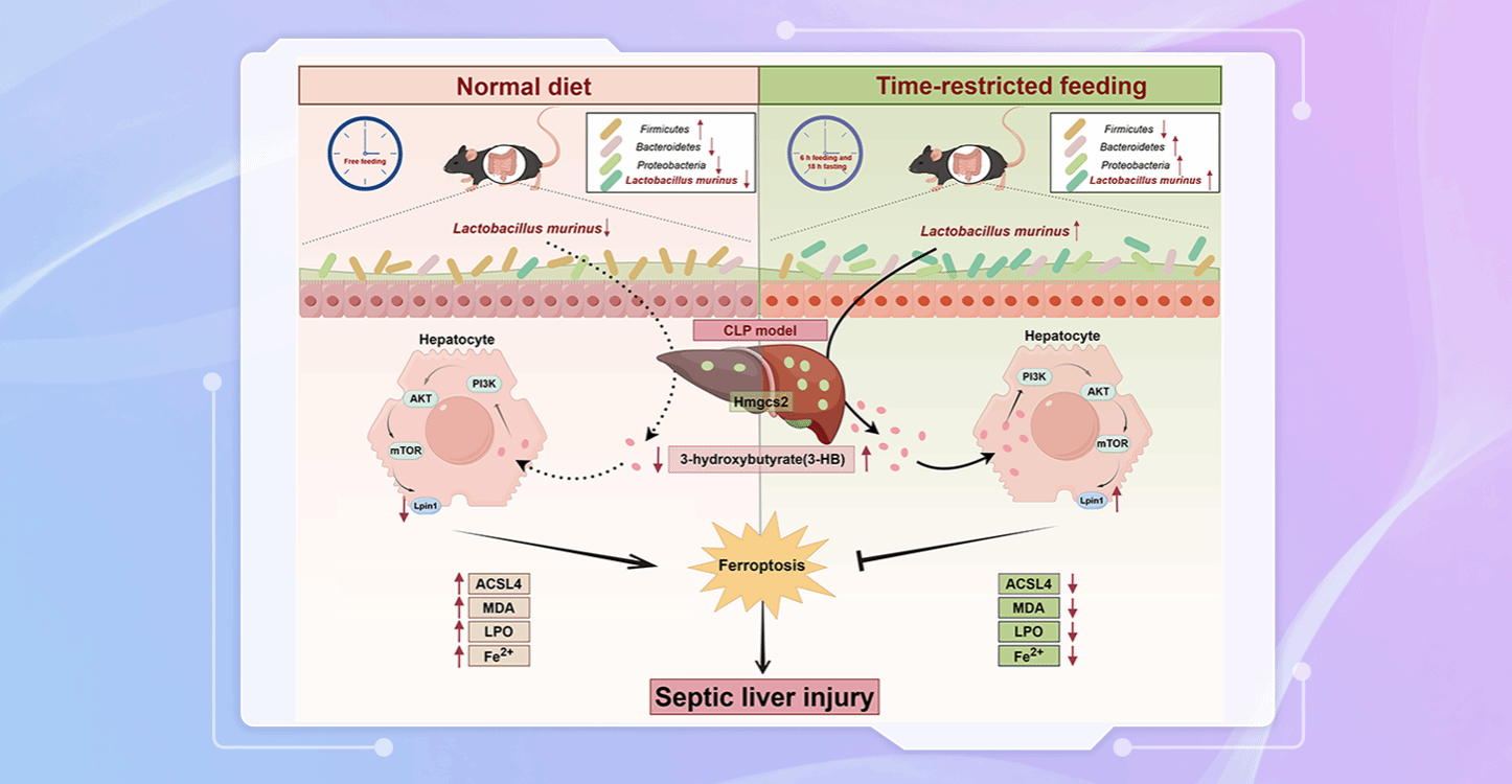 每天把吃饭时间压缩到固定8-12小时(比如早8点到晚6点),不仅能减肥,还能在脓毒症(严重感染引发的器官损伤)中保护肝脏。近日,南方医院麻醉科刘克玄团队通过研究揭示背后的秘密武器是肠道里的“好细菌”和它们产生的“护肝素”。限时进食(TRF)可通过调控肠道菌群-宿主代谢轴,显著缓解脓毒症引发的肝损伤。刘克玄研究团队结合动物实验与临床队列数据证实,限时进食能够“唤醒”肠道有益菌鼠乳杆菌(Lactobacillus murinus...