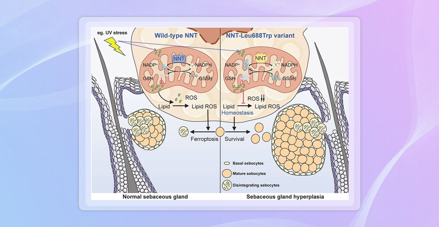 早发性弥漫性家族性皮脂腺增生(Premature Diffuse Familial Sebaceous Hyperplasia, PDFSH)是一种罕见的遗传性皮肤病,该疾病患者进入青春期后,面部会逐渐出现大量淡黄色丘疹,融合为斑块,可伴随皮脂分泌增加,给患者外观带来诸多困扰。近日,皮肤病医院林志淼、汪慧君团队联合陈荃、汪盛教授研究取得突破,首次确定PDFSH的致病基因为NNT,并揭示其功能获得性突变导致疾病的发生。研究团队在三个PDFSH家系中发现,患者的NNT...
