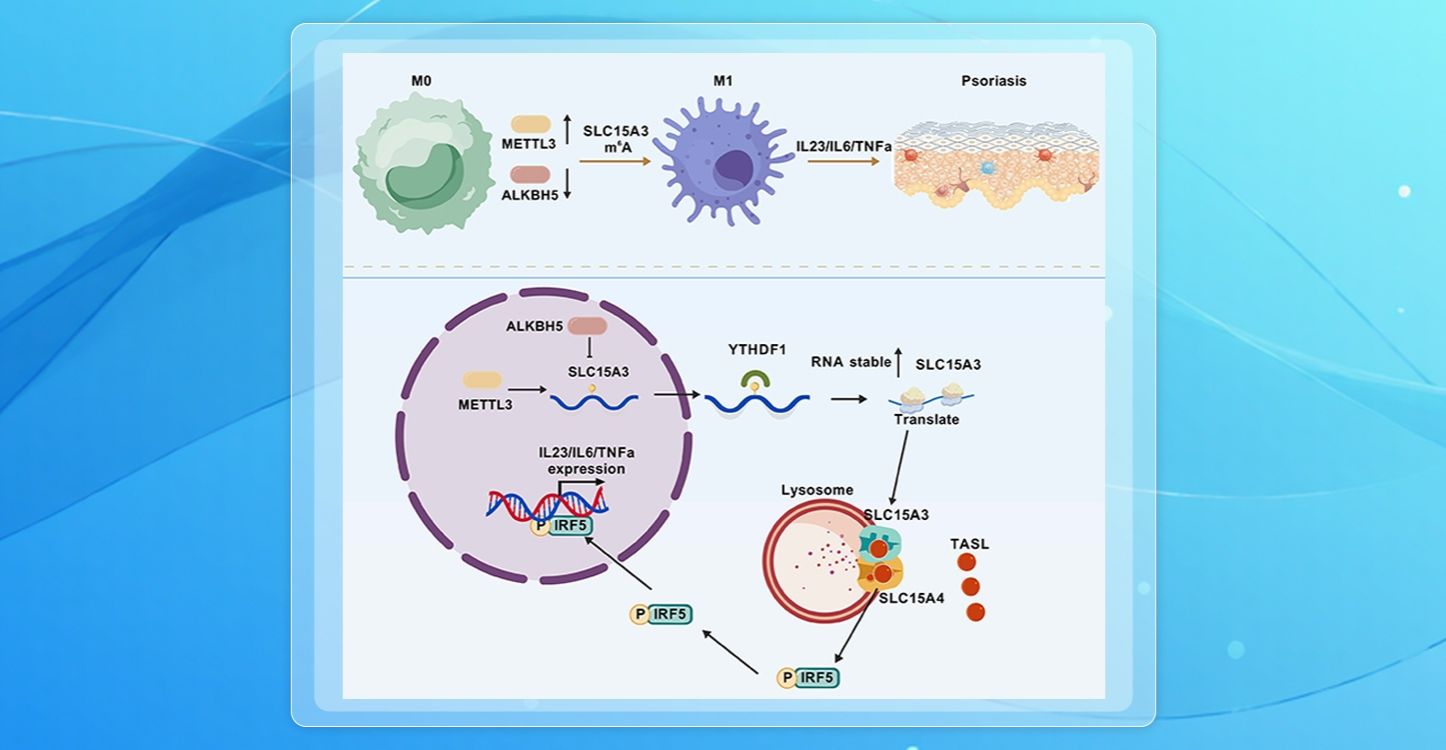 近日,皮肤病医院荣知立和杨斌团队发布研究成果,首次阐明RNA表观修饰通过"SLC15A3-TASL-IRF5"信号轴驱动巨噬细胞M1极化,参与银屑病发病的新机制。该研究为炎症性皮肤病治疗提供了全新干预靶点。银屑病是一种常见的慢性复发性炎症性皮肤病,病因涉及遗传、免疫、环境等多重因素。近年来研究不断发现,银屑病的发生不仅依赖于T细胞等获得性免疫的激活,还与固有免疫系统,尤其是巨噬细胞的极化状态密切相关。M1型巨噬细胞可通过...