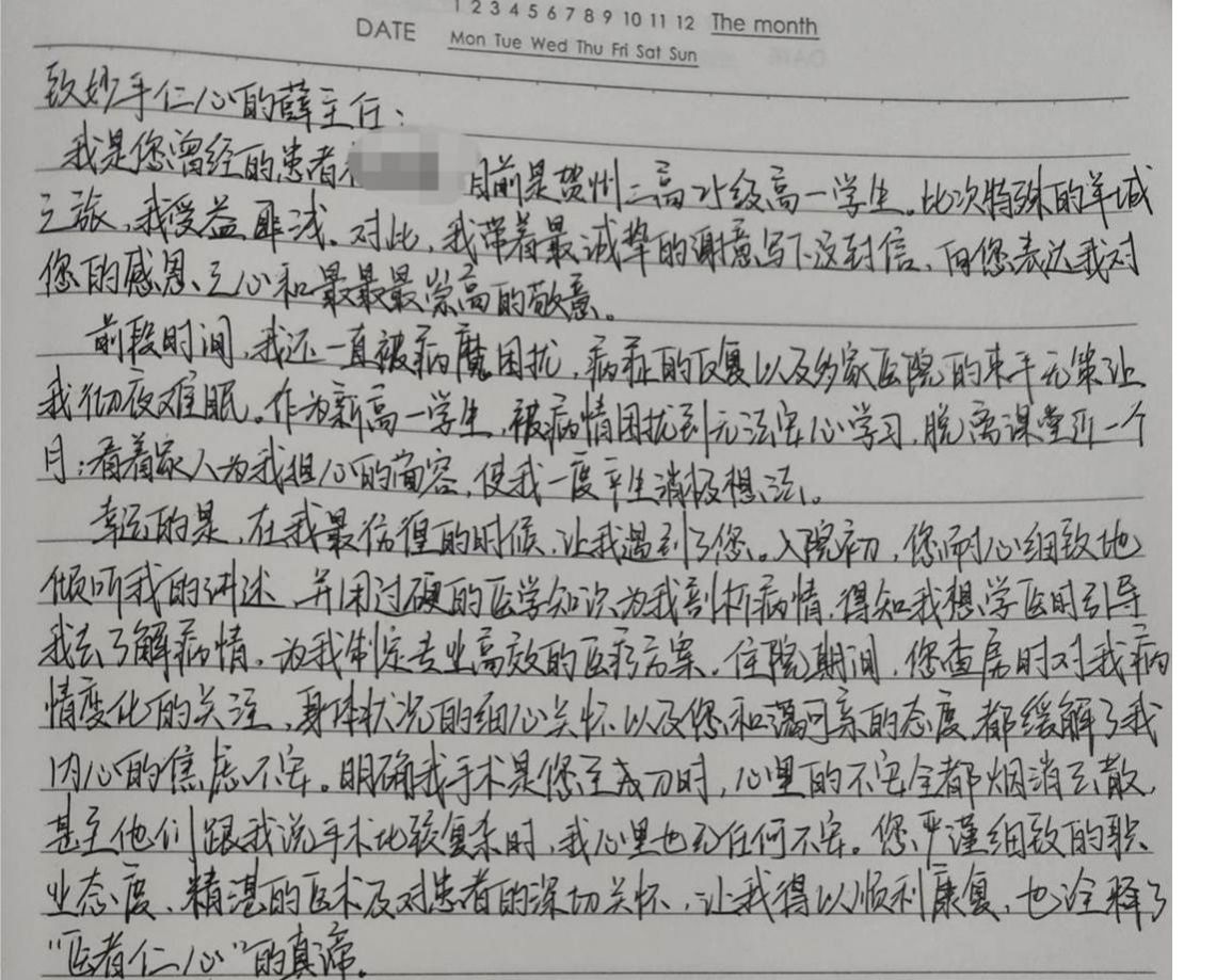 近日,南方医科大学中西医结合医院普外科主任薛琪收到了一封特殊的感谢信。这封信没有华丽的辞藻,却用最真挚的笔触,记录了一位高一女生从被病魔困扰到重获健康、从内心彷徨到坚定理想的心路历程。这封如“论文”般详实而充满感情的来信,再次诠释了“有时去治愈,常常去帮助,总是去安慰”的医学人文内涵,成为医院优质医疗服务最温暖的注脚。