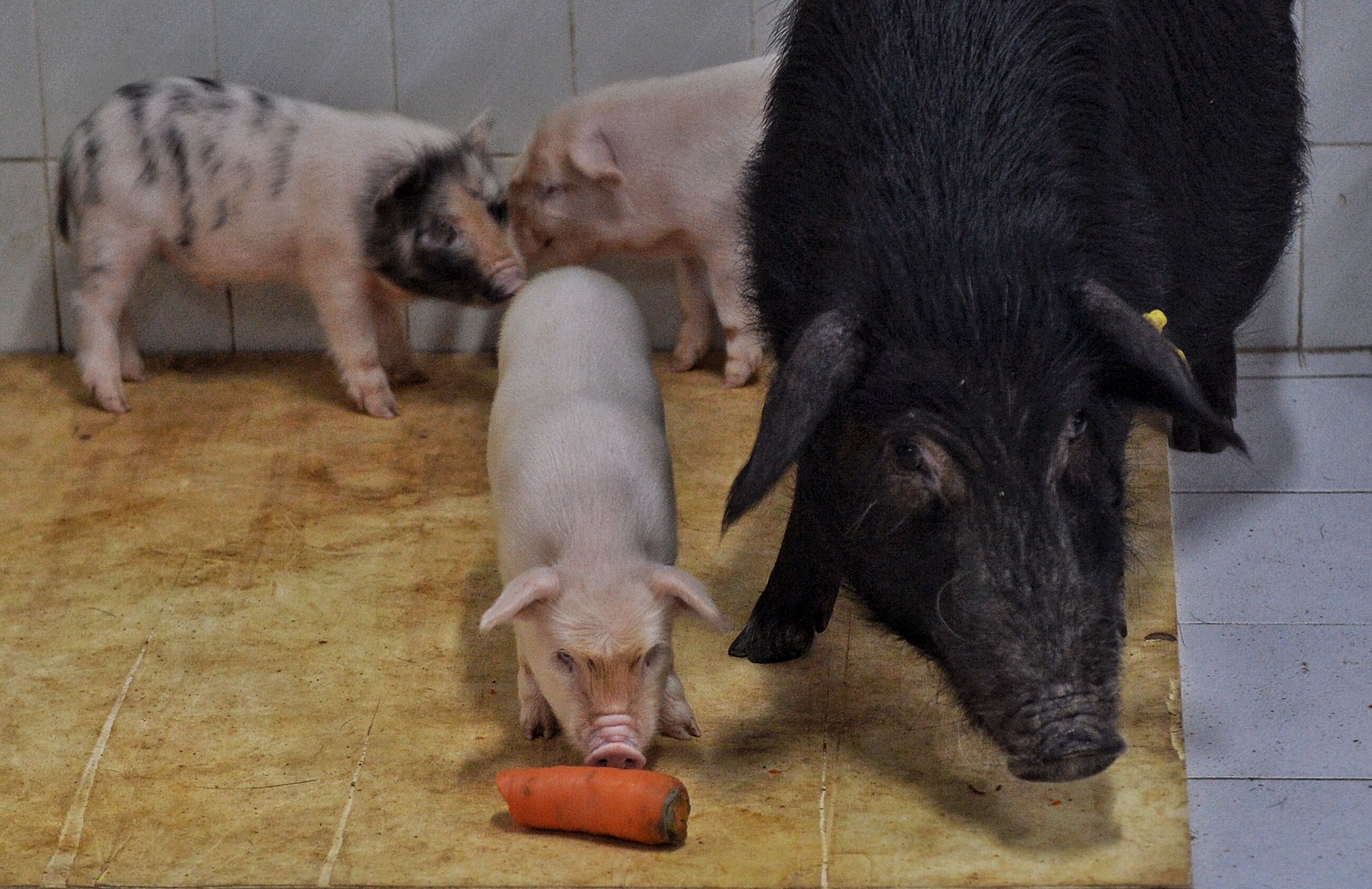 与免疫相关的基因被敲除,变成可代人试药、试疗法的“药用猪” 南方医科大学实验动物中心,三周大的白化西藏小型猪与小黑猪及母猪在一起。