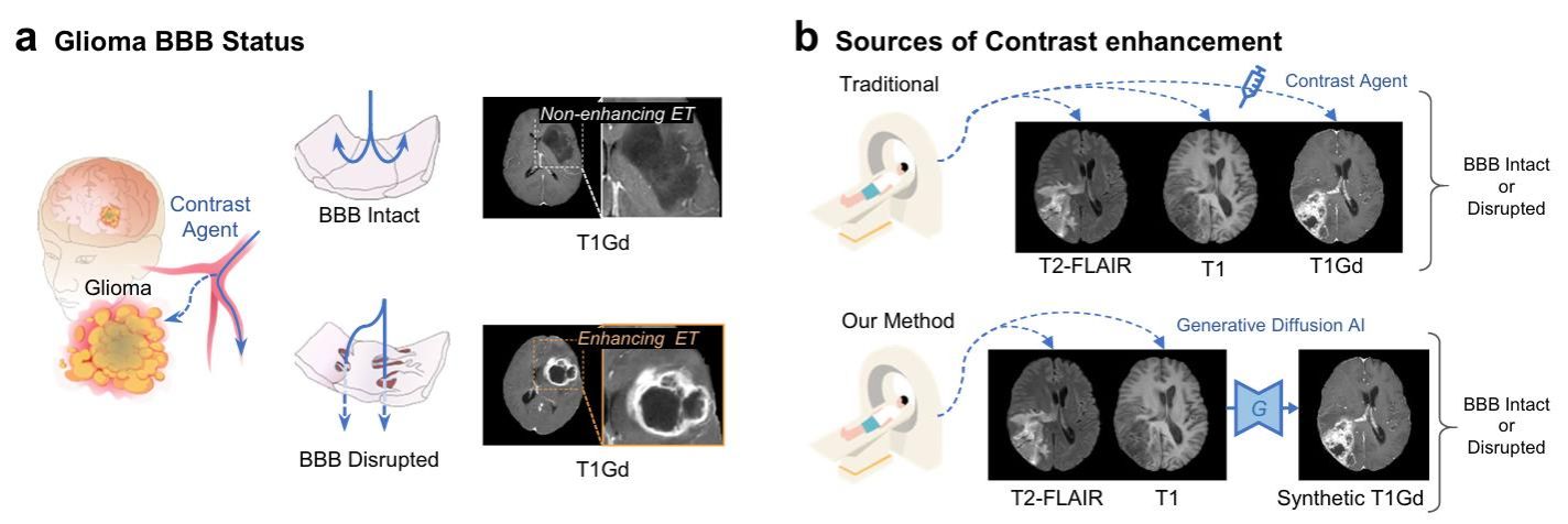 南方医科大学南方医院教授吴元魁团队联合南方医科大学生物医学工程学院教授阳维/钟丽明团队,提出一种基于生成式扩散模型的无对比剂血脑屏障状态识别模型CBSI(Contrast-free BBB Status Identification)。该模型仅凭平扫MRI即可准确判断胶质瘤患者的血脑屏障完整性,有望使大量患者免于钆对比剂注射,为脑肿瘤精准诊疗开辟新路径。相关成果近日发表于《自然-通讯》。