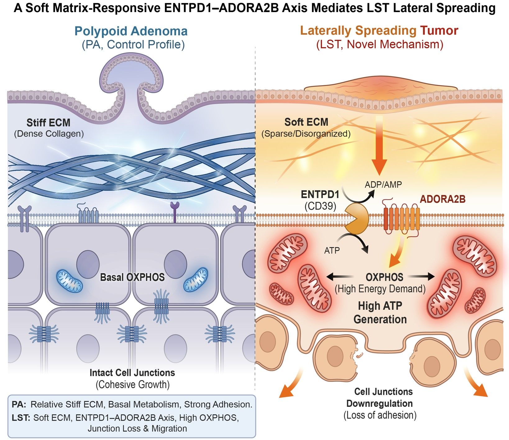南方医科大学南方医院副主任医师韩泽龙、教授黄冰与刘思德团队首次系统揭示了结直肠侧向发育型肿瘤(LSTs)独特的侧向生长机制,提出ENTPD1-ADORA2B信号轴可作为关键调控节点,为该类高危癌前病变的早期诊断、风险分层与精准治疗提供了新思路。近日,相关成果在线发表于《先进科学》(Advanced Science)。